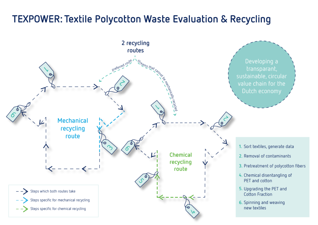 In het project TEXPOWER (Textile Polycotton Waste Evaluation and Recycling) toont CPI aan dat dit mogelijk is. Dit project is in juli van dit jaar officieel van start gegaan en omvat een uniek consortium van bedrijven dat de hele waardeketen van polykatoen vertegenwoordigt (zie kader).